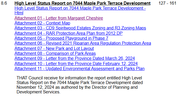 This link should take you to the latest update on the development that Council received last November. High Level Status Report on 7044 Maple Park Terrace Development – Html