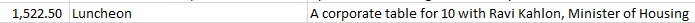 A corporate table for 10 at a UDI Luncheon with Ravi Kahlon Minister of Housing, cost BC Housing (the taxpayer), according to an entry $1,522.50 The end price in the Excel document entry for January shows even higher at $1,709.40, and then there’s an additional $810.80 for the same event entered a week later. Given that the UDI charges $300 for elected officials to be in attendance. Kahlon’s presence may have brought the total price to the taxpayer for just that one table to over $2000.