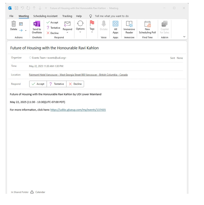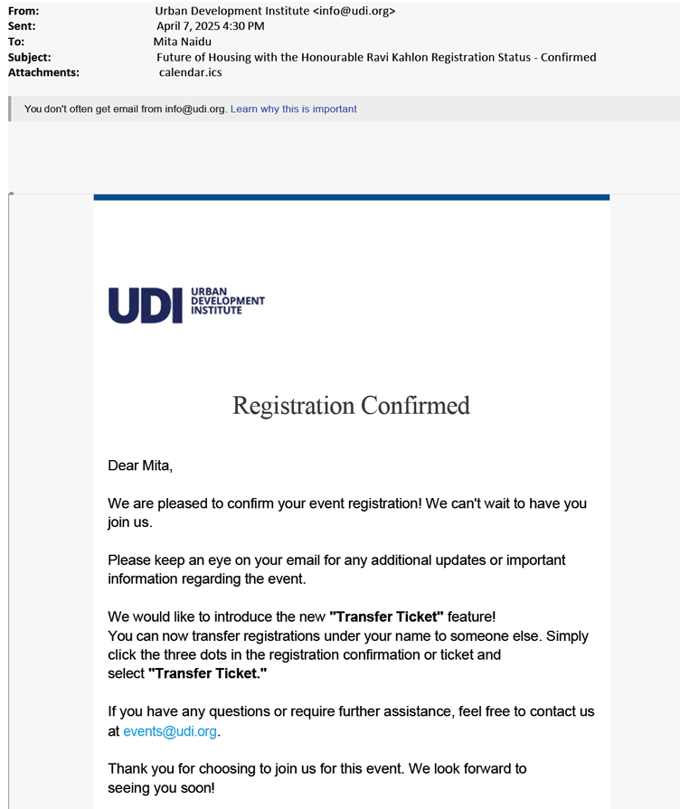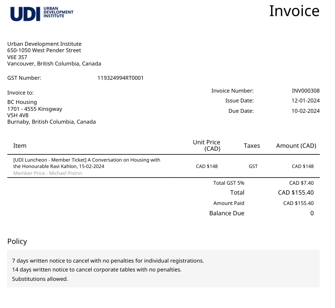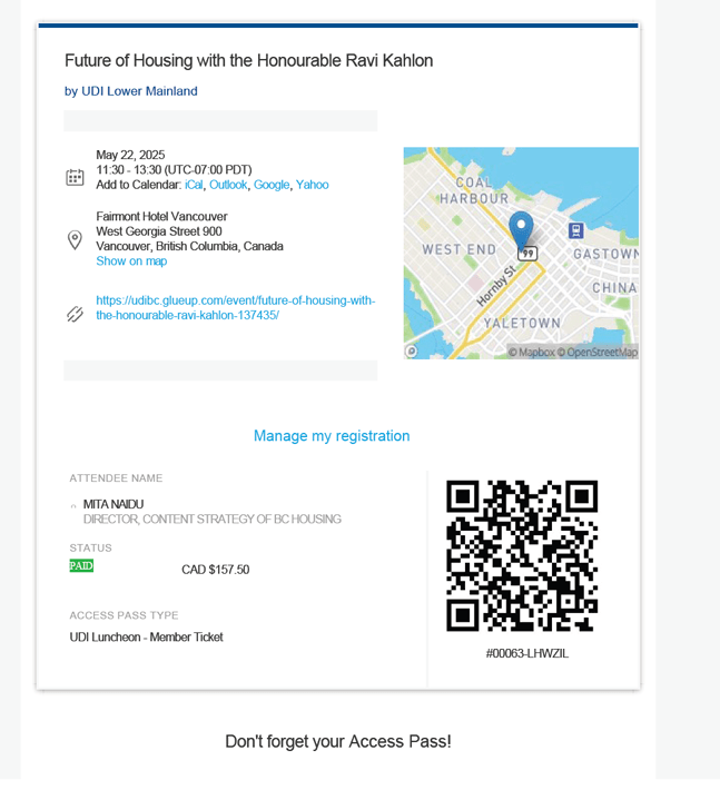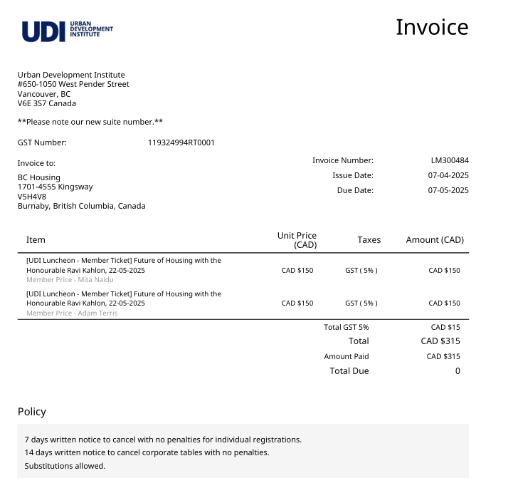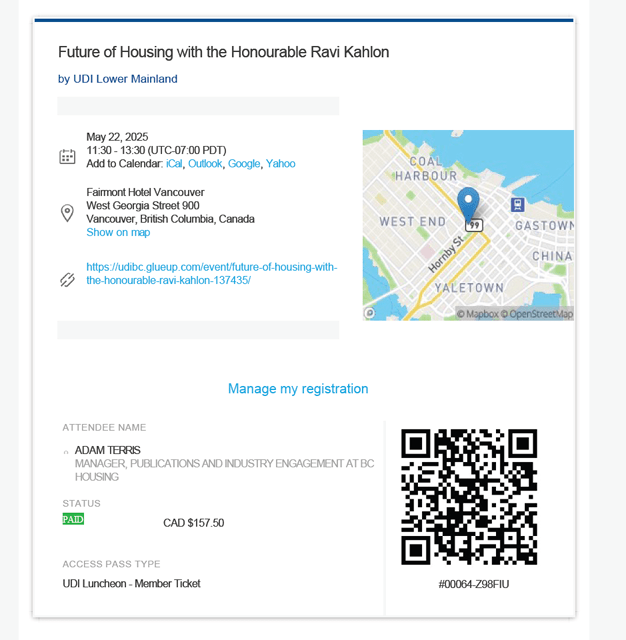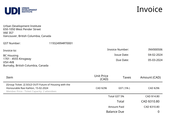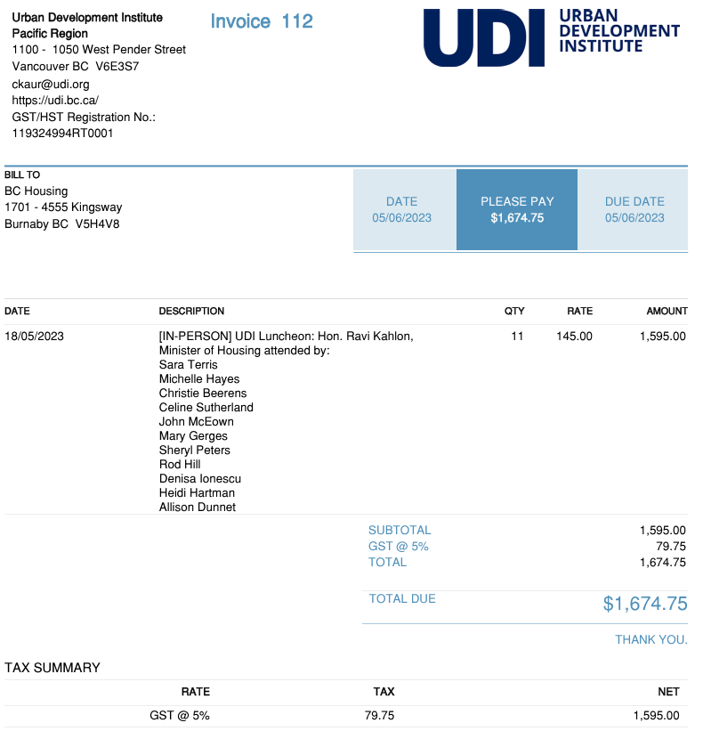 Documentation of payments (covered by the taxpayer) for BC Housing Employees to attend UDI events with Ravi Kahlon from: FOI 292-30-9925