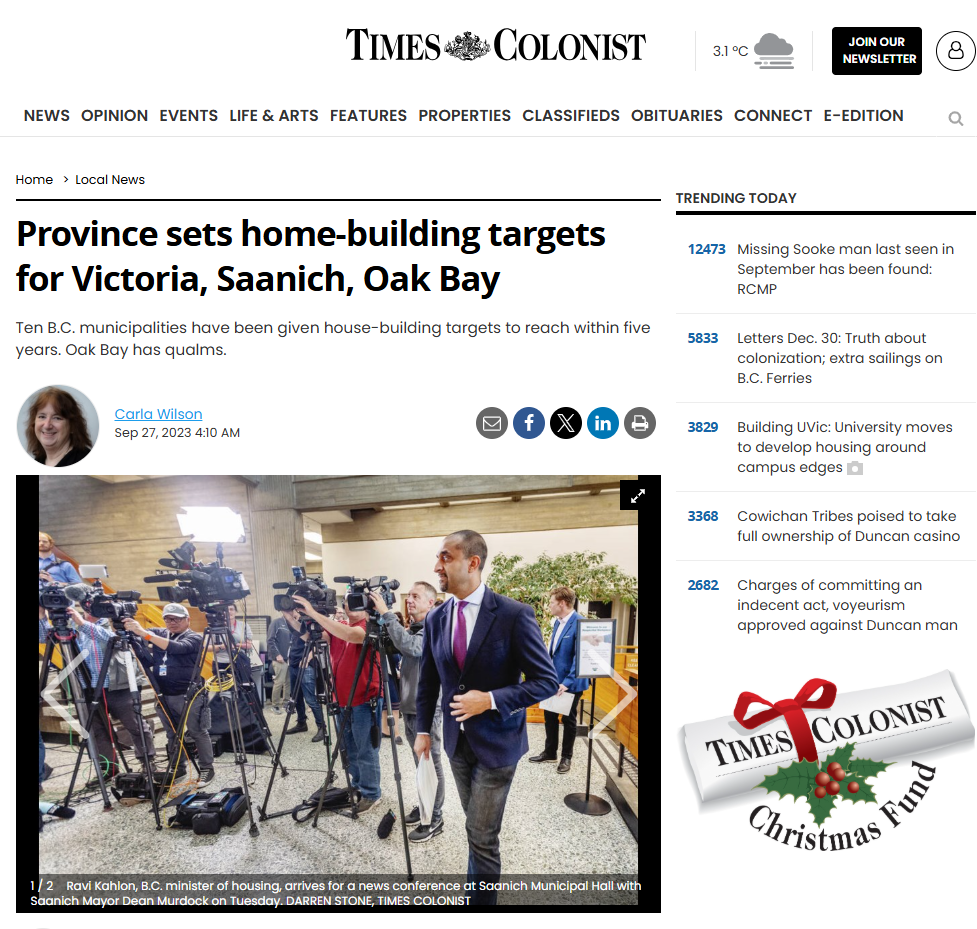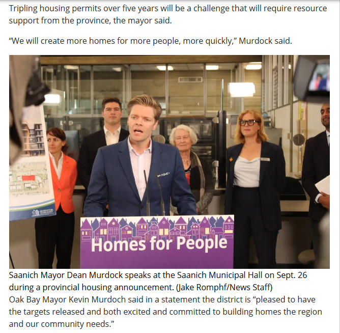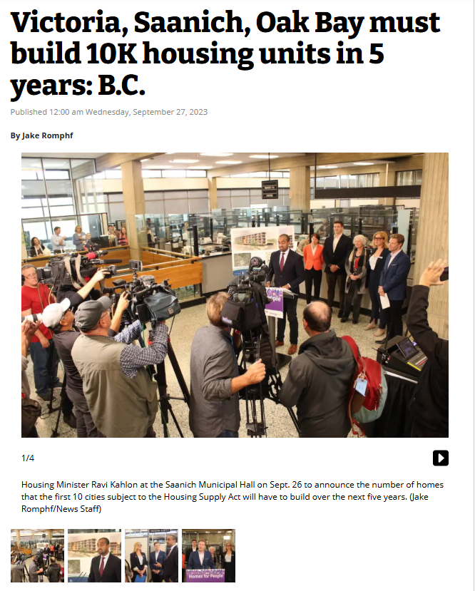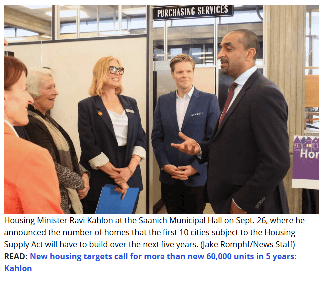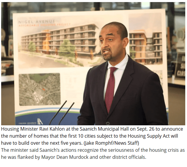 The following are screen captures of TC articles from 2 years ago, whereby Kahlon made announcements of housing bill 44 and housing targets, with Saanich’s Mayor Dean Murdock standing like a good trooper, loyally in support.