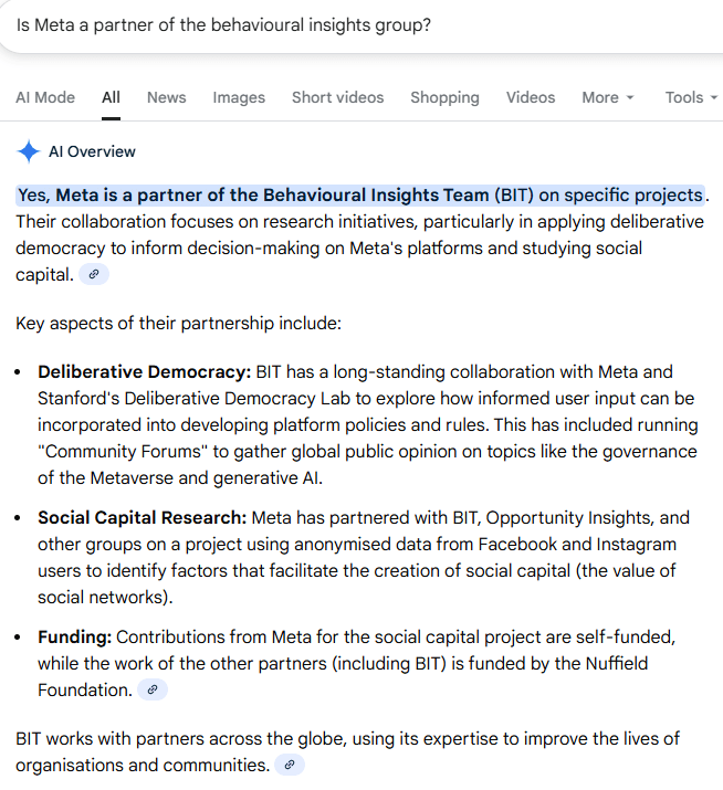 A couple years ago, I stumbled across BC’s Behavioural Insights group, which also refers to itself as BC BIG, with no sense of irony – it is BC’s Big Brother. At the time, I recall they mentioned that their partners include META, Impact Canada, and the UK Cabinet Office.
