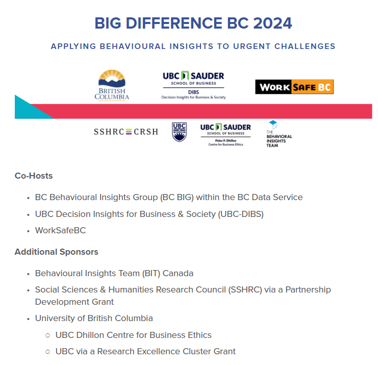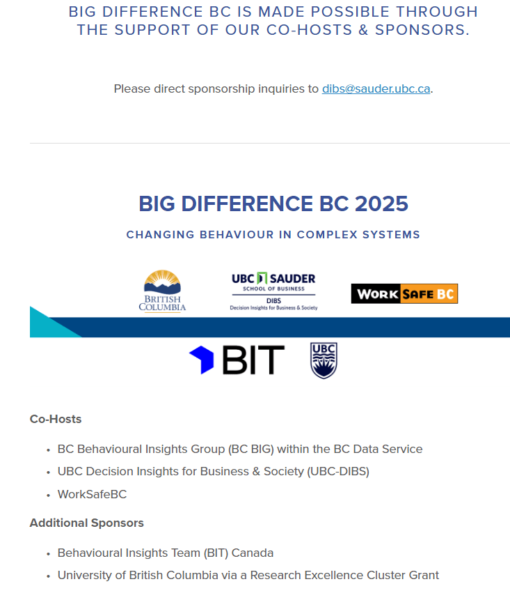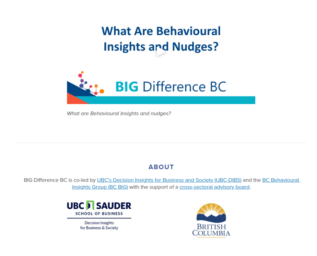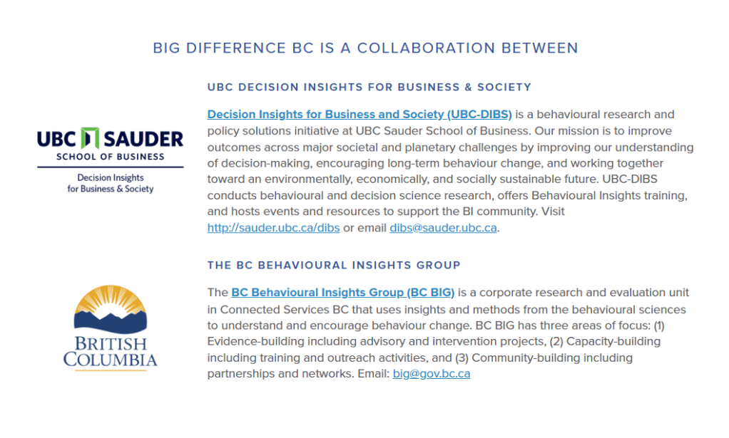 “The BC Behavioural Insights Group (BC BIG) is a corporate research and evaluation unit in Connected Services BC that uses insights and methods from the behavioural sciences to understand and encourage behaviour change. BC BIG has three areas of focus: (1) Evidence-building including advisory and intervention projects, (2) Capacity-building including training and outreach activities, and (3) Community-building including partnerships and networks. Email: big@gov.bc.ca“