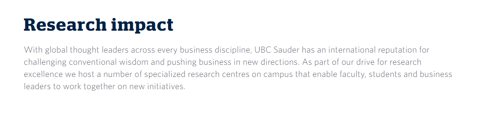 With global thought leaders across every business discipline, UBC Sauder has an international reputation for challenging conventional wisdom and pushing business in new directions. As part of our drive for research excellence we host a number of specialized research centres on campus that enable faculty, students and business leaders to work together on new initiatives.”