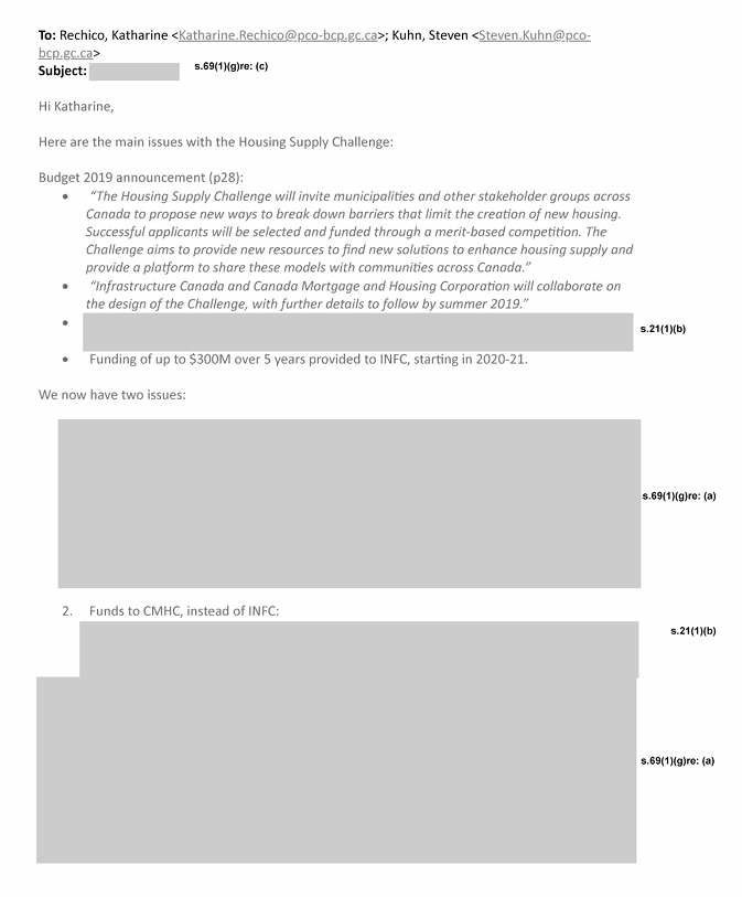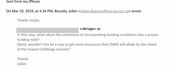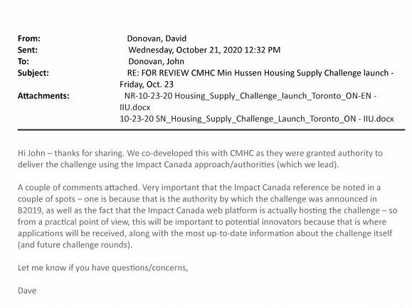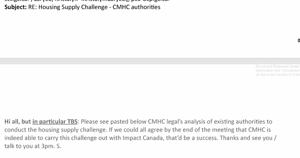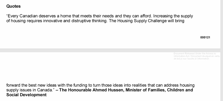 What I received was a mere 56 pages, with heavy redactions. There was not much to enlighten as to why the CMHC teamed up with Impact Canada to engage on the several hundred million dollar Housing Supply challenge, but there were some clues.