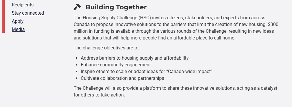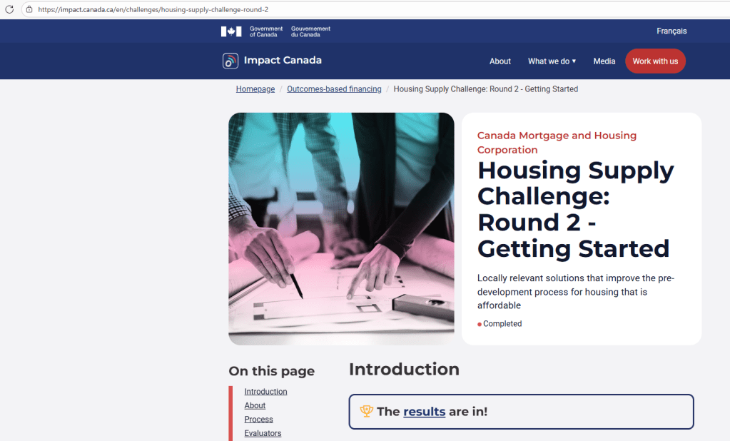 What I found most questionable was Impact Canada’s 300 million dollar housing supply challenge, in partnership with the CMHC, the Canada Mortgage and Housing Corporation.