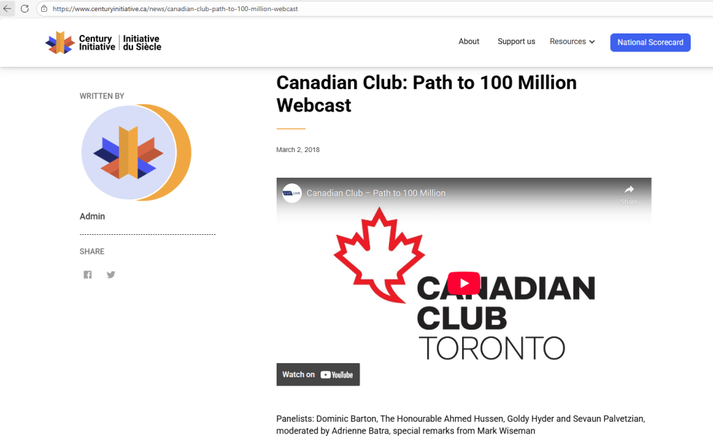 Ahmed Hussen, while Federal Minister of Immigration, Refugees and Citizenship, engaged with the Century Initiative through a function called “Path to 100 Million”. Dominic Barton of McKinsey and co-founder of the Century Initiative lobby, also took part on the panel.
