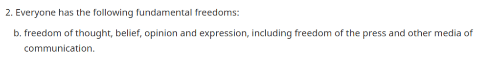 The following is Section 2(b), of the Canadian Charter of Rights and Freedoms, part of the Constitution of Canada: