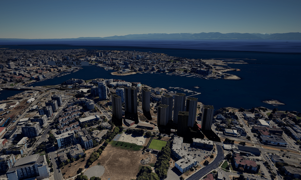 A simulation of the future skyline around the Bayview Roundhouse area in Vic West.