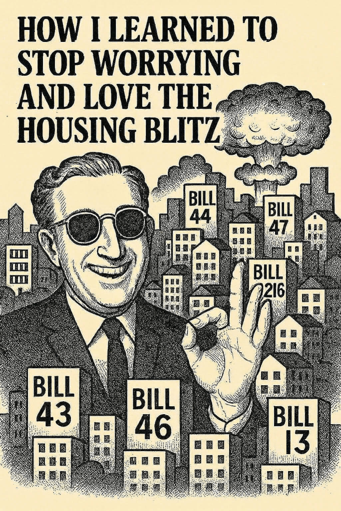 That is how I learned to stop worrying and love the housing policy blitz (not really). Not because the blitz served the public, but because the public was never meant to be part of it. The policies were never designed to help young families; they were engineered to reshape land‑use authority in ways that benefited those already positioned to profit. The housing policy blitz was implemented before any “middle‑income crisis” narrative even existed, because the narrative wasn’t the catalyst. It was the cover.