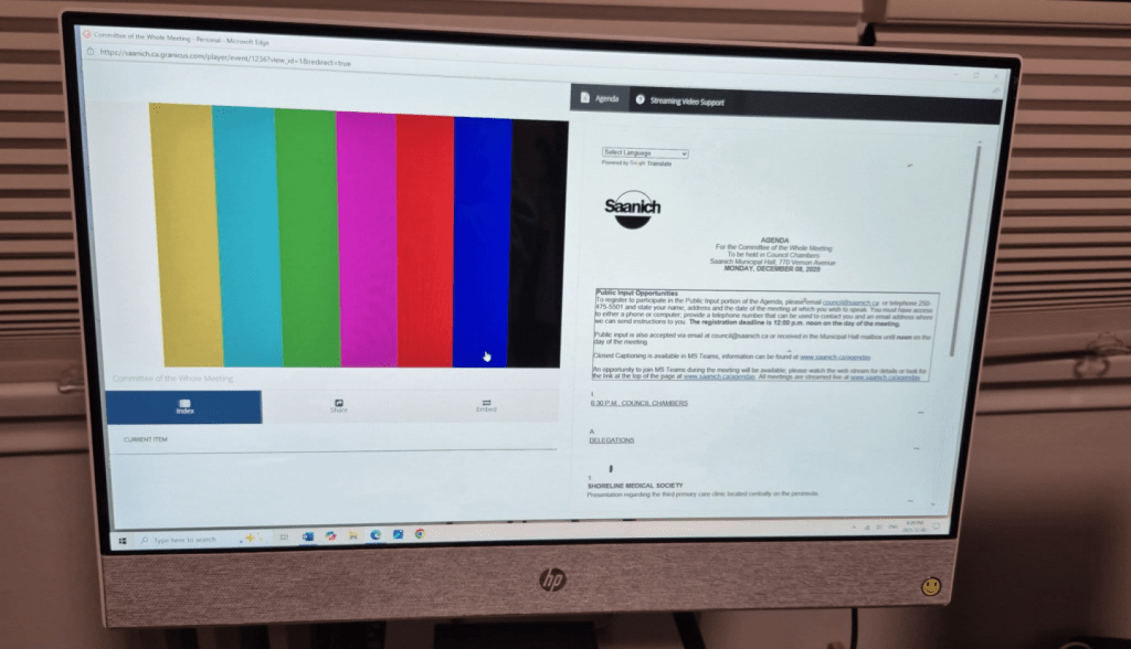 Above image from the now available Dec 8, 2025 Saanich Committee of the Whole Meeting, which while not initially available was posted at some time later. Only an audio feed can be heard, yet the audio feed did not broadcast on the Saanich website on the evening of the meeting on Dec 8, 2025.