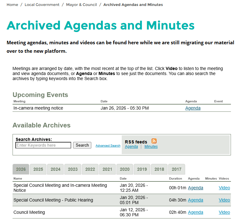 With a new system recently implemented many people do not intuitively know where to find the archived agendas, videos and minutes of meetings of council. Previously it was available on the agendas page, but at the time of writing it is not on that page, but can be reached by clicking a link on that page.