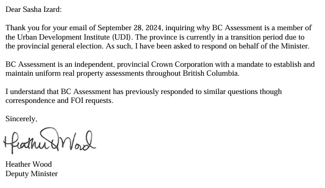 Thank you for your email of September 28, 2024, inquiring why BC Assessment is a member of the Urban Development Institute (UDI). The province is currently in a transition period due to the provincial general election. As such, I have been asked to respond on behalf of the Minister.