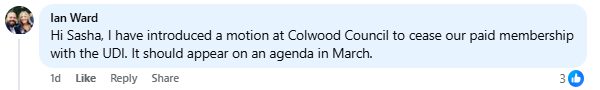 The morning after the decision in Victoria was made, Councillor Ian Ward of Colwood, posted on the CRD Watch Facebook page that he has “introduced a motion at Colwood Council to cease our paid membership with the UDI. It should appear on an agenda in March.”