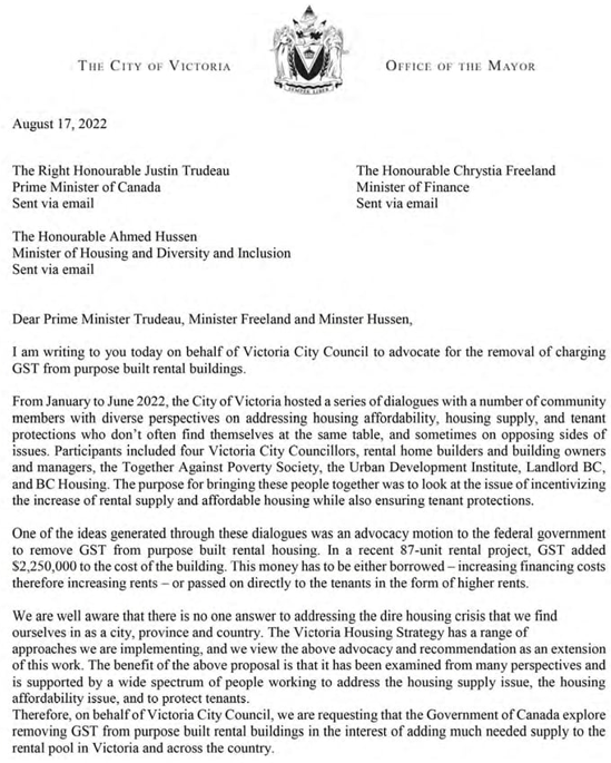 I am writing to you today on behalf of Victoria City Council to advocate for the removal of charging GST from purpose built rental buildings.