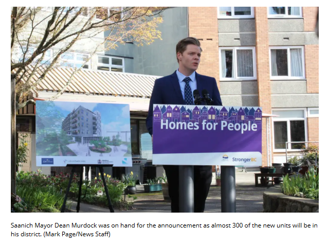 In 2024 Dean Murdock (above) advanced the Province’s Homes For People Plan. See also the photo op taken by the Mayor at Saanich City Hall with Housing Minister Kahlon as the provincial housing targets for Saanich were announced: BC housing initiatives announced twice this week – Island Social Trends