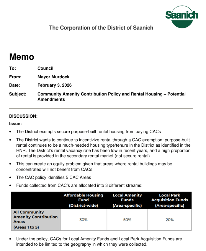 How does it not align with other CRD Local Government practices? What housing policy best practices are you referring to? Is it material sent to the district by the UDI Capital Region? How does this have anything to do with the Housing Needs Report, which was created by a UDI member company Urban Systems, through its subsidiary Urban Matters? On July 17, 2023 Urban Systems, advised Saanich on policy regarding community amenity contributions (CACs), density bonuses and cash in lieu. They also mentioned that land-lift/upzoning could increase value by 50%. As reported in the Saanich News, council approved a reduction in the CAC rate by 60% that night.