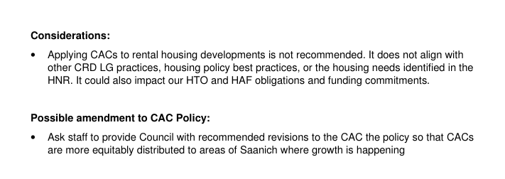 The document continues, [Applying CACs to rental housing developments] “does not align with other CRD Local Government practices, housing policy best practices, or the housing needs identified in the Housing Needs Report. It could also impact our Housing Target Order and Housing Accelerator Fund obligations and funding commitments.”