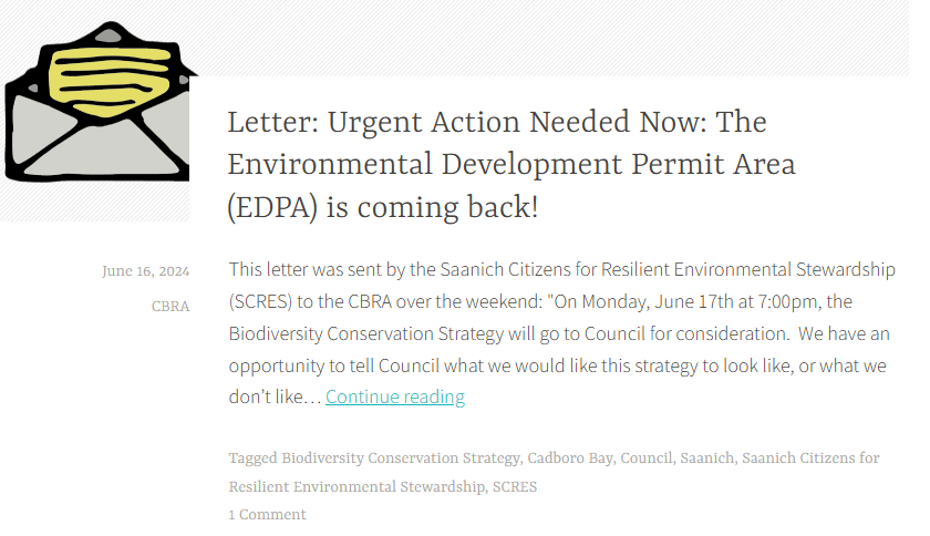 The CBRA blocked a letter several months earlier to the last posting, which warned of the imminent demise of the Cadboro Bay Local Area Plan, something that took place in May of 2024.