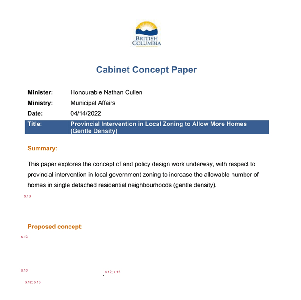 The month after the UDI’s lobbying to Eby on this issue in March 2022, Nathan Cullen, the Minister of Municipal Affairs at the time put forward in April of 2022, a Cabinet Concept Paper with the title: “Provincial Intervention to Allow More Homes (Gentle Density)”.