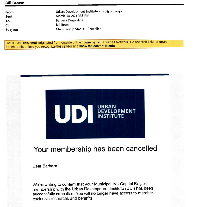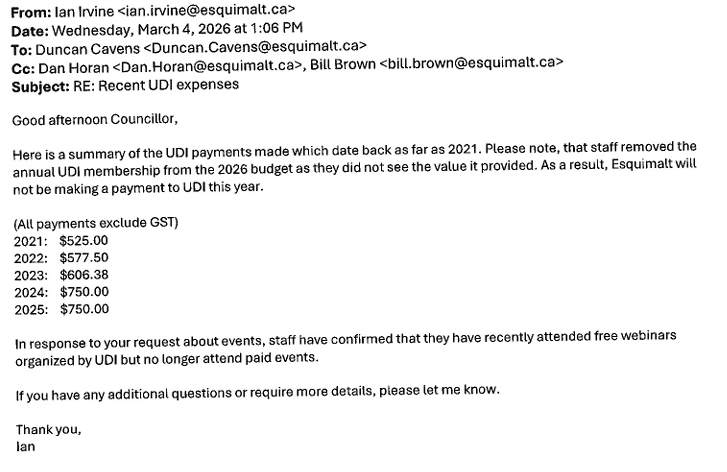 On March 4, 2026, only 15 minutes before the email that township staff sent to the UDI informing them at they would not be renewing the membership in 2026, an email circulated among those concerned with the issue, indicated that Esquimalt staff will not be making a payment to the UDI in 2026, as they did not see that it provided value.