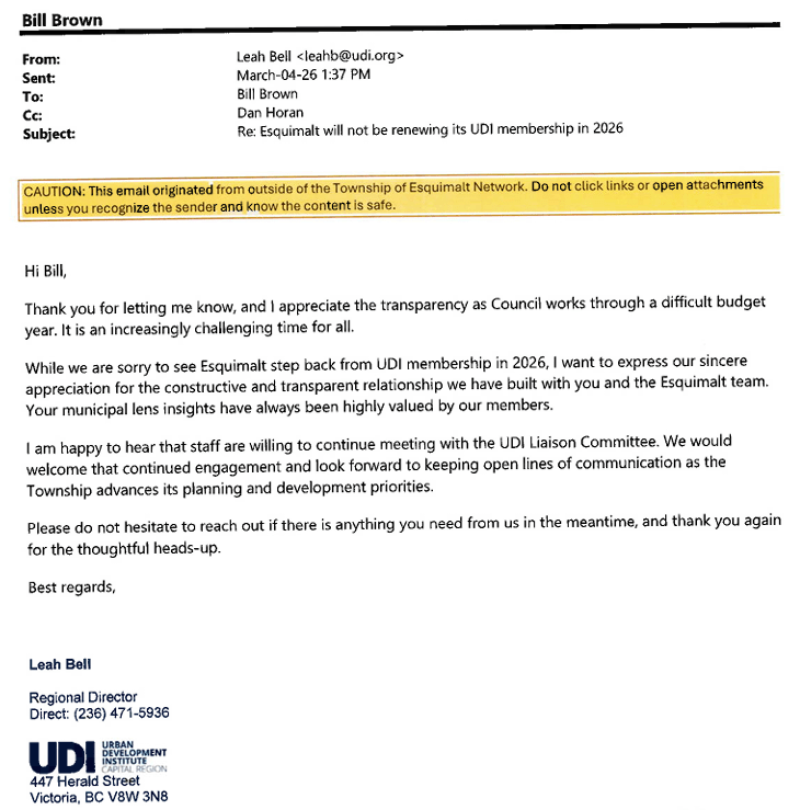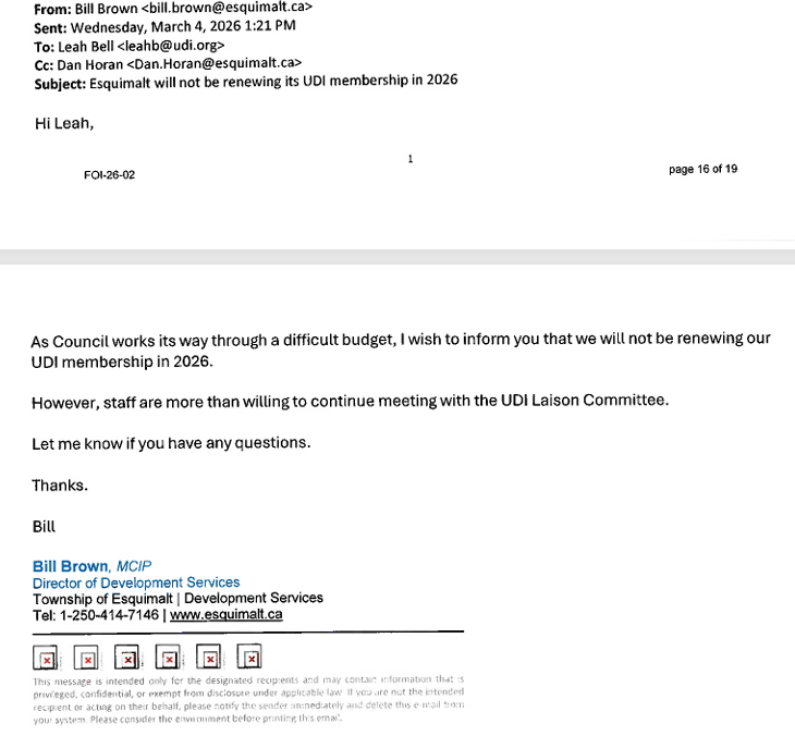 The following day on March 4, 2026 – The Township of Esquimalt’s Director of Development Services wrote to the UDI informing them that the Township will not be renewing its UDI membership in 2026.