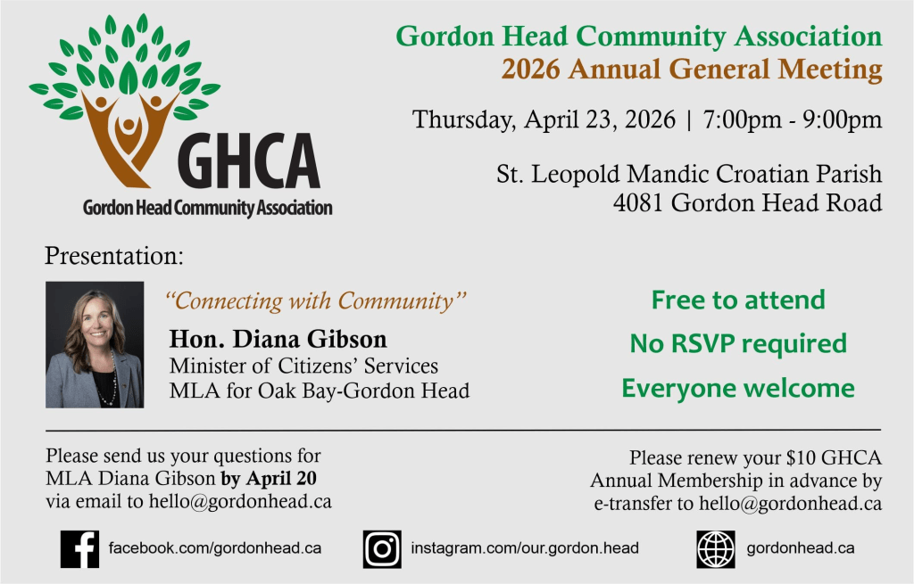Now in 2026, with another potential election not far off, MLA Gibson is a featured presenter at the Gordon Head Community Association’s Annual General Meeting (AGM). Once again, the questions are being accepted, and hence can be screened in advance. I’ll wager a friendly bet, that no questions regarding Gibson’s Bill 9, which would allow the BC government to limit access to information, will be allowed.
