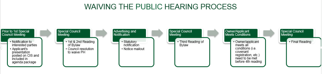 A chart created by the District of Saanich during the pandemic, showing how waiving the public hearing process would be achieved: